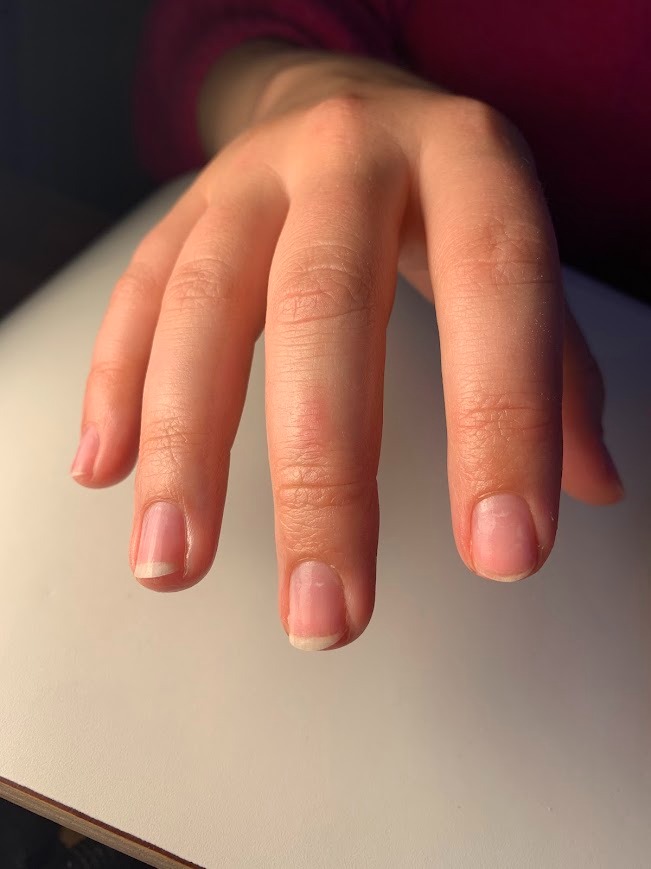 Hierbij gaan we dus de natuurlijke nagels verstevigen zonder extra lengte toe te voegen.